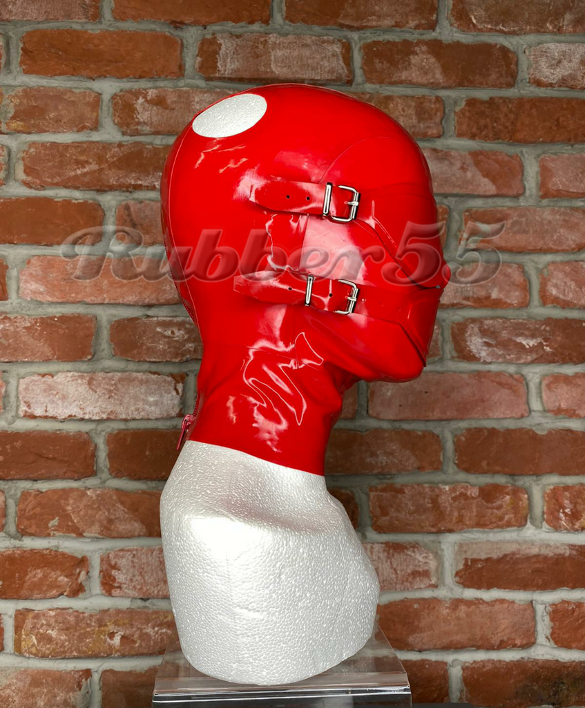 Our sleek Hood55 combined with a bondage hood style blindfold and gag for the best of both worlds. This hood has two reinforced holes for the wearers own hair. This hood has a rear zip fastening.